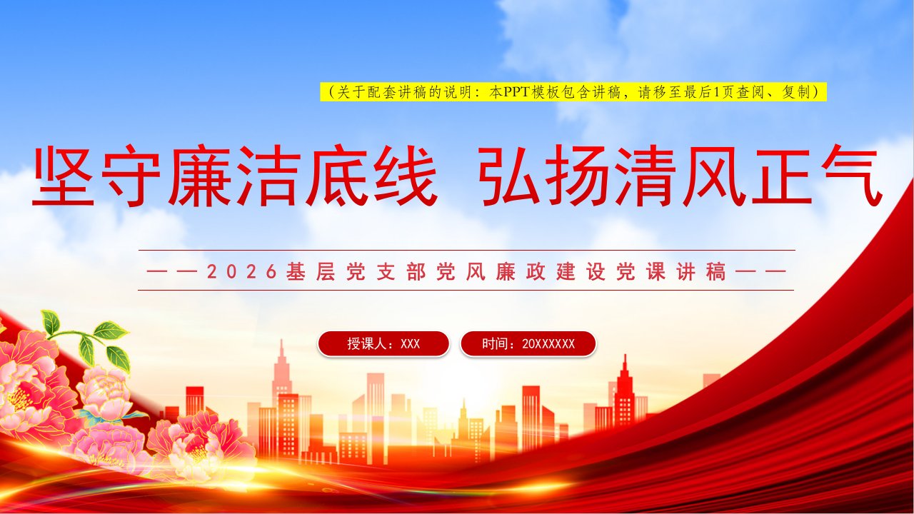 2026微党课「廉洁反腐ppt模板」坚守廉洁底线弘扬清风正气基层党支部党风廉政建设党课ppt模板(含配套讲稿)