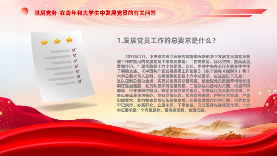 标题:2024微党课2023在青年和大学生中发展党员的有关问答党组织建设基层党务ppt模板(带内容)