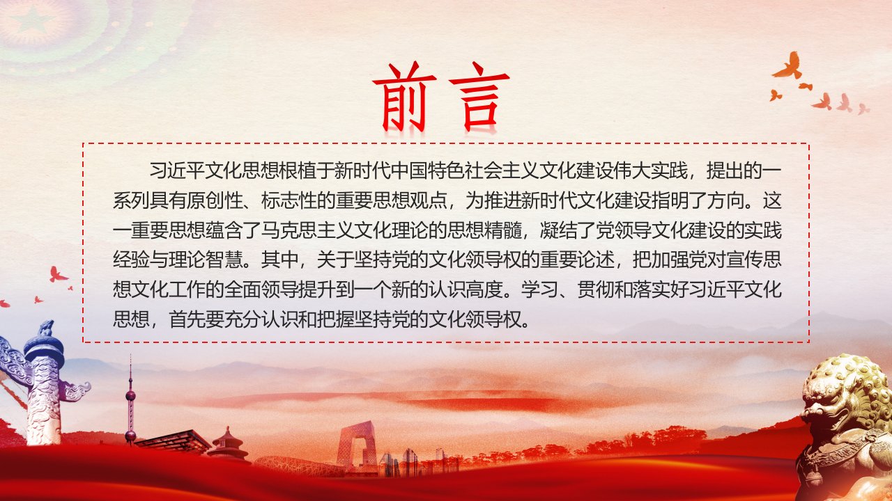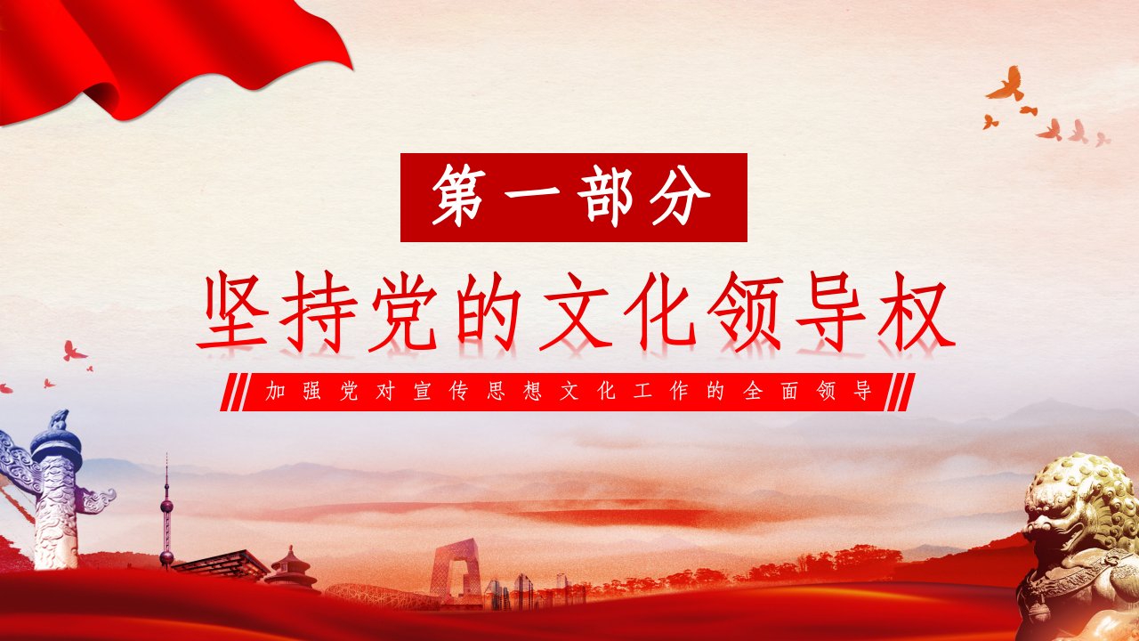 2024年坚持党的文化领导权加强党对宣传思想文化工作的全面领导党课ppt模板(含配套讲稿)党员干部学习党课课件
