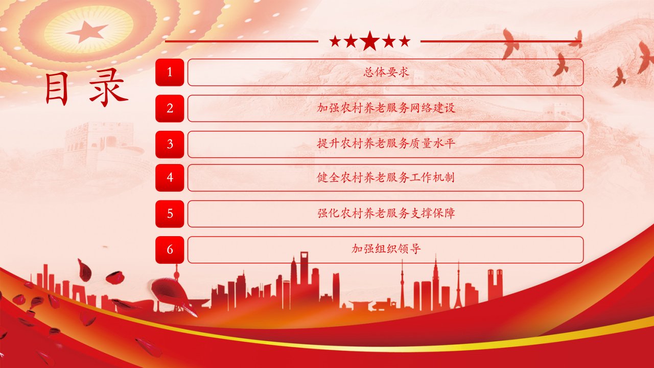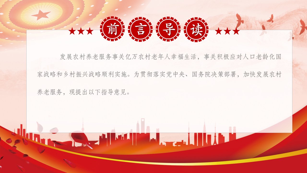 2024微党课关于加快发展农村养老服务的指导意见为贯彻落实党中央、国务院决策部署,加快发展农村养老服务,现提出以下指导意见党课ppt模板(带内容)讲党课ppt模板下载