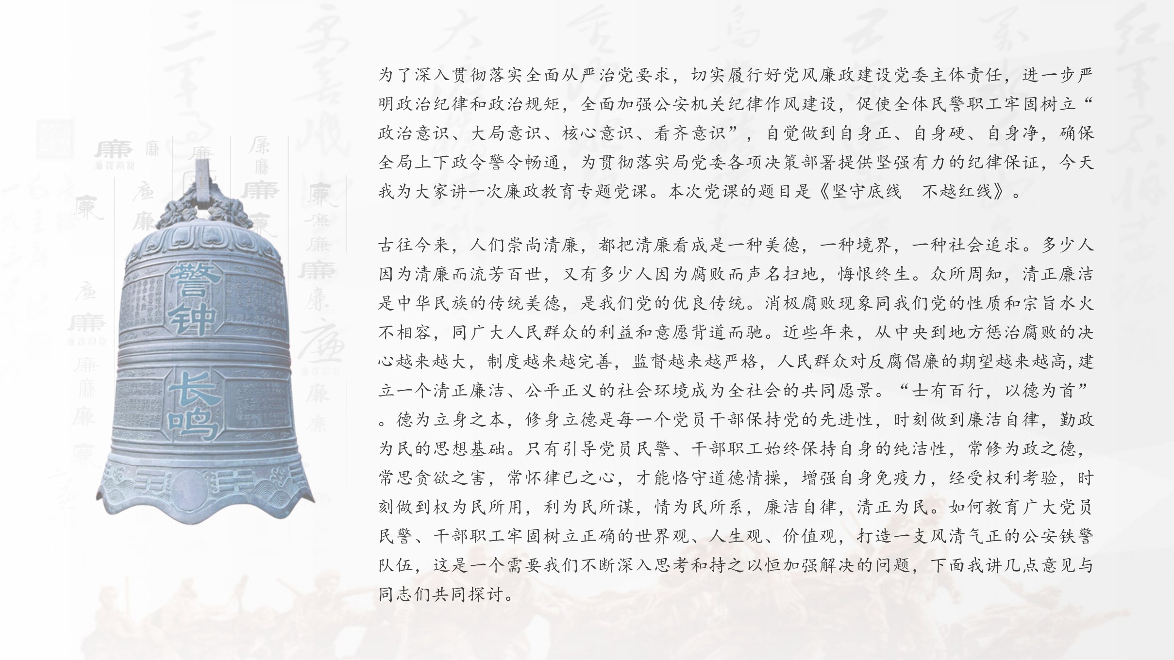 党课ppt,党课课件,党员干部,党课ppt模板,作风建设,公安,党课,学习,公安机关,大局意识,坚守底线,不越红线,ppt模板2024微党课坚守底线 不越红线全面加强公安机关纪律作风建设,促使全体民警职工牢固树立“政治意识、大局意识、核心意识、看齐意识”,自觉做到自身正、自身硬、自身净,确保全局上下政令警令畅通党课ppt模板(含配套讲稿)党员干部学习党课课件党课ppt,党课课件,党员干部,党课ppt模板,作风建设,公安,党课,学习,公安机关,大局意识,坚守底线,不越红线,ppt模板2024微党课坚守底线 不越红线全面加强公安机关纪律作风建设,促使全体民警职工牢固树立“政治意识、大局意识、核心意识、看齐意识”,自觉做到自身正、自身硬、自身净,确保全局上下政令警令畅通党课ppt模板(含配套讲稿)党员干部学习党课课件