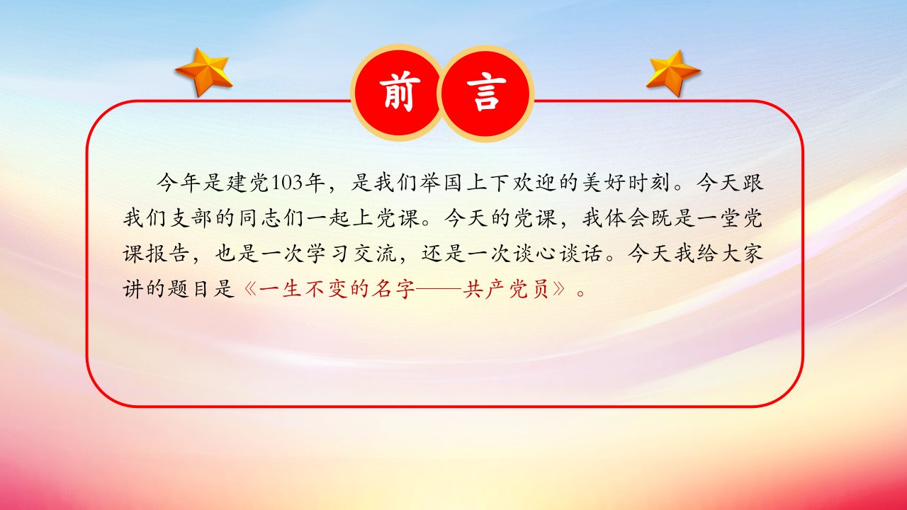 2024微党课热烈庆祝中国共产党建党103周年一生不变的名字——共产党员(带内容)党支部党课ppt模板下载不忘入党初心 牢记党员身份