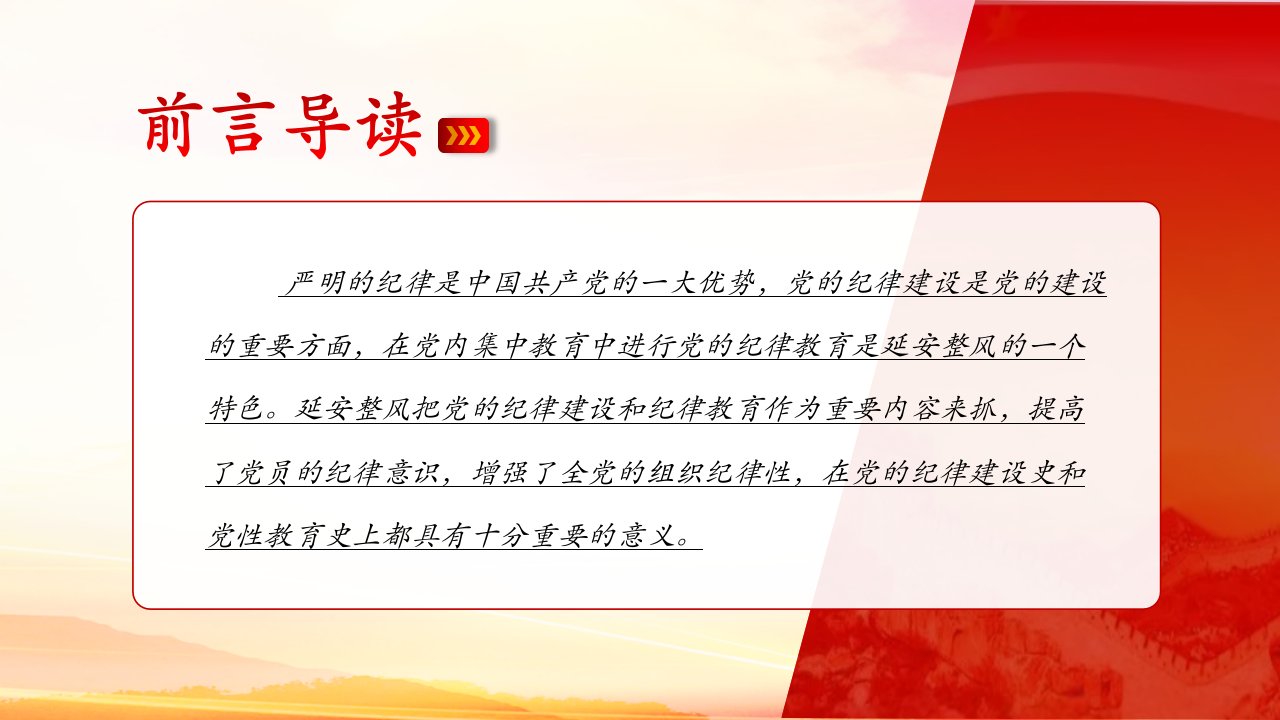 2024微党课延安整风把党的纪律建设和纪律教育作为重要内容来抓,提高了党员的纪律意识,增强了全党的组织纪律性,在党的纪律建设史和党性教育史上都具有十分重要的意义(带内容)讲党课ppt模板下载