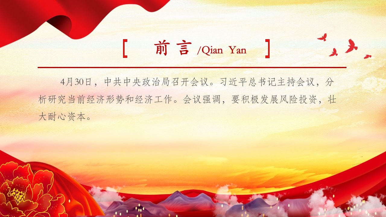 2024微党课4月30日,中共中央政治局召开会议总书记主持会议,分析研究当前经济形势和经济工作会议强调,要积极发展风险投资,壮大耐心资本ppt模板(含配套讲稿)党员干部学习党课课件