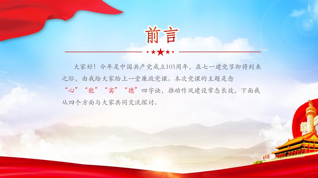 2024微党课七一廉政党课念好“心”“能”“实”“德”四字诀,推动作风建设常态长效党课ppt模板(含配套讲稿)党支部团支部党员干部学习党课课件