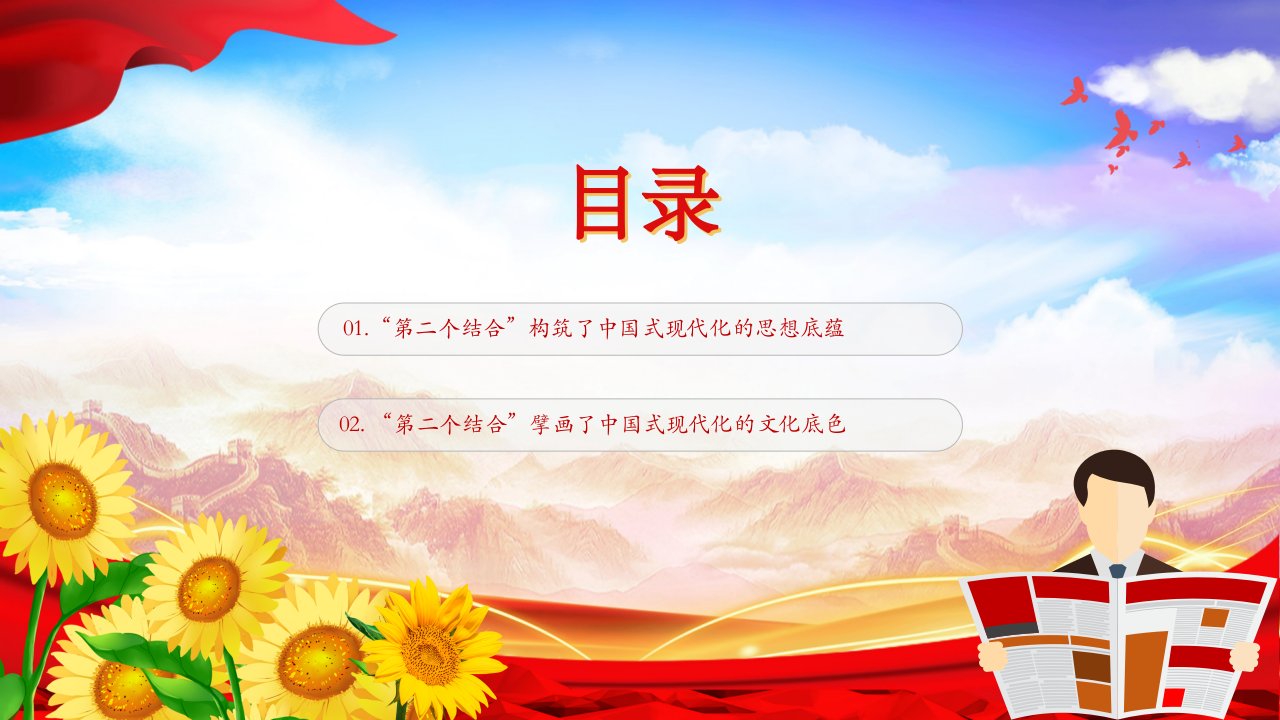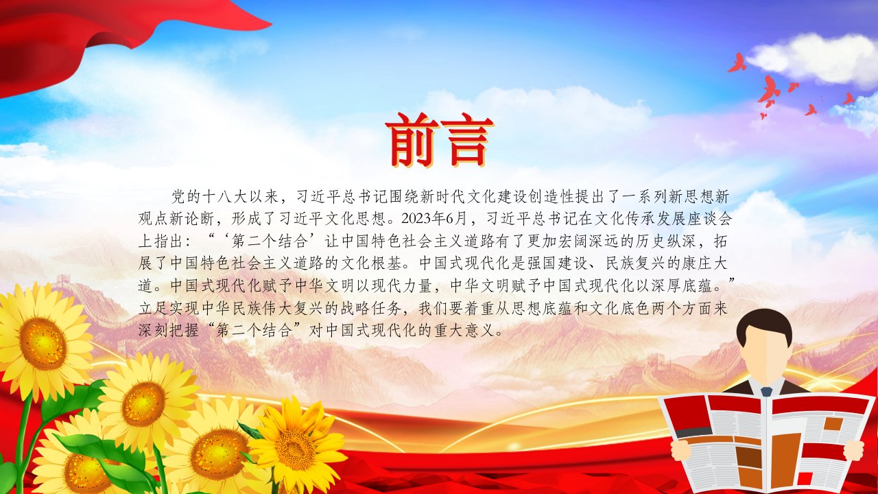 2024微党课总书记在文化传承发展座谈会上指出:“‘第二个结合’让中国特色社会主义道路有了更加宏阔深远的历史纵深,拓展了中国特色社会主义道路的文化根基。中国式现代化是强国建设、民族复兴的康庄大道(含配套讲稿)党员干部学习党课课件