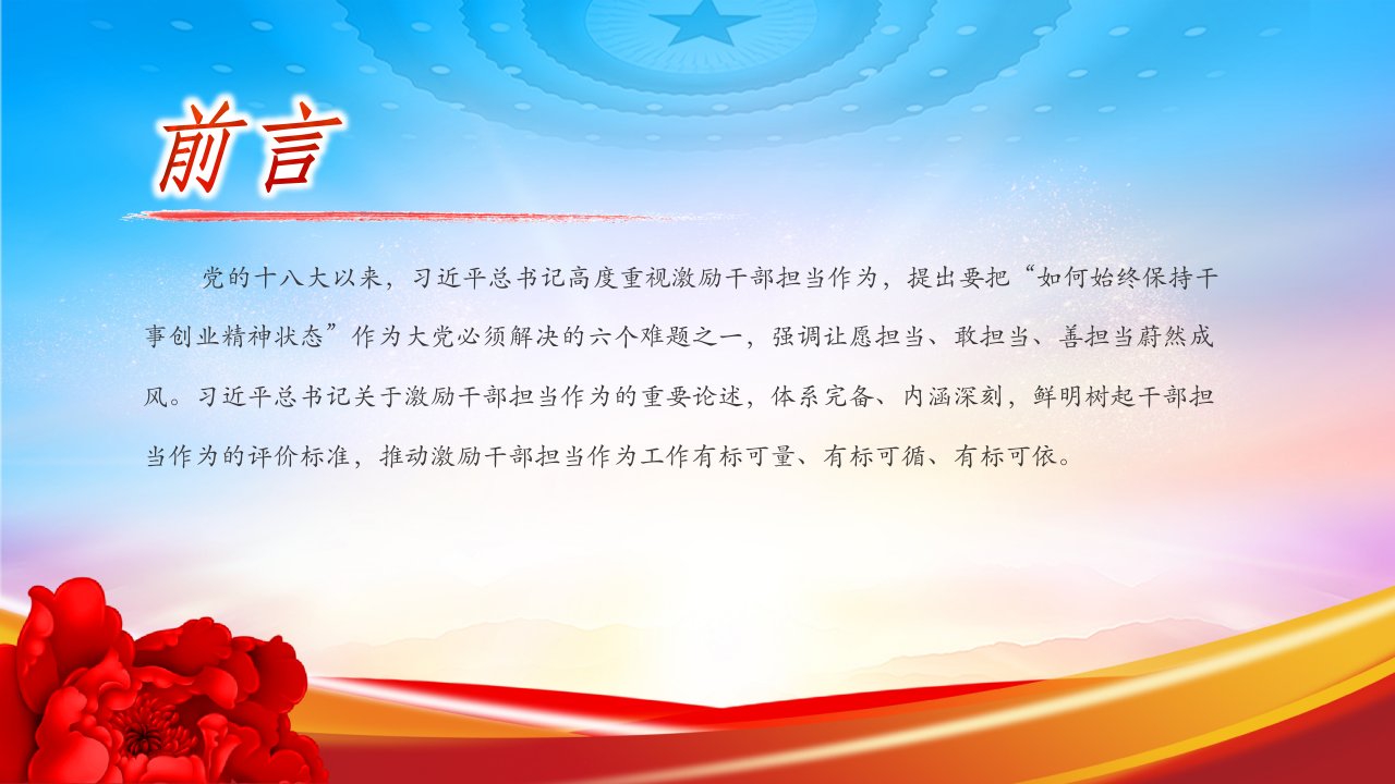 2024微党课党的十八大鲜明树起干部担当作为评价标准如何始终保持干事创业精神状态(含配套讲稿)党员干部学习党课课件