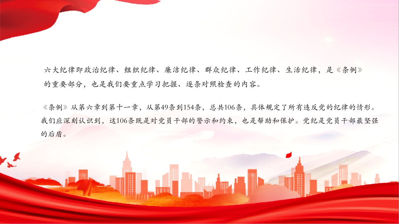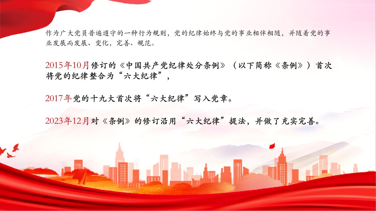 2024微党课六大纪律即政治纪律、组织纪律、廉洁纪律、群众纪律、工作纪律、生活纪律,是《条例》的重要部分,也是我们要重点学习把握、逐条对照检查的内容(带内容)讲党课ppt模板下载