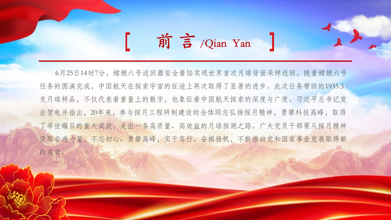 2024微党课从“探月精神”中汲取“奋进力量”科技强国 6月25日14时7分,嫦娥六号返回器安全着陆实现世界首次月球背面采样返回党课ppt模板(含配套讲稿)党员干部学习党课课件