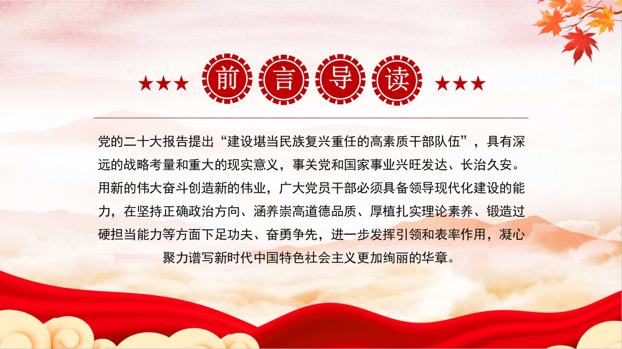 2024微党课锻造具备领导现代化建设能力的干部队伍,党的二十大报告提出“建设堪当民族复兴重任的高素质干部队伍”,具有深远的战略考量和重大的现实意义,事关党和国家事业兴旺发达、长治久安(带内容)讲党课ppt模板下载