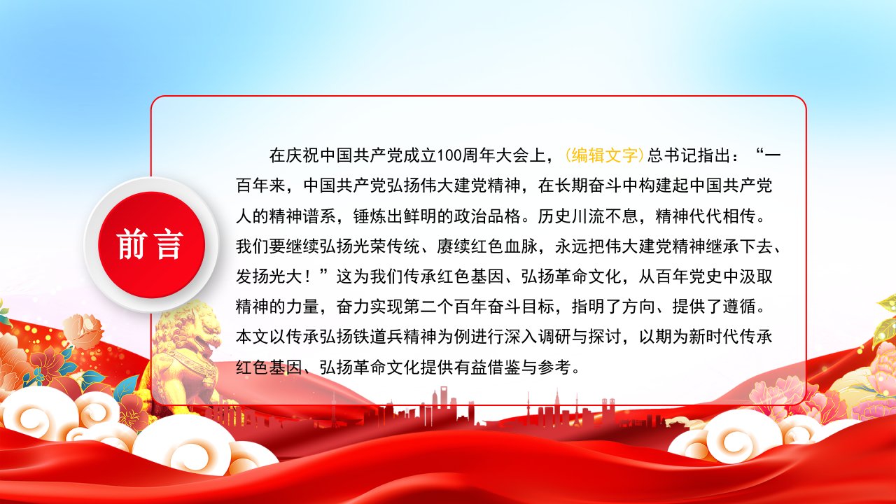 2024微党课以传承弘扬铁道兵精神为例进行深入调研与探讨,以期为新时代传承红色基因、弘扬革命文化提供有益借鉴与参考(带内容)讲党课ppt模板下载