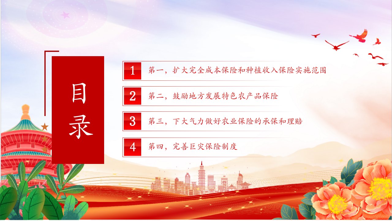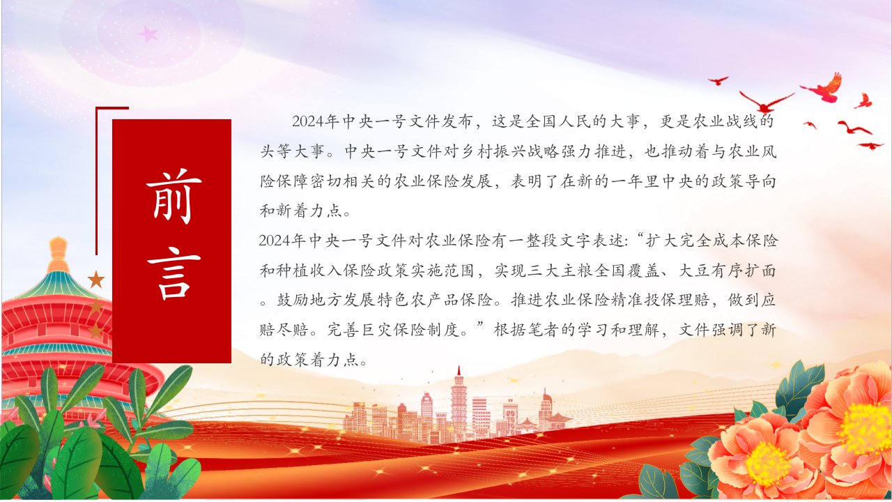2024微党课中央一号文件发布,这是全国人民的大事,更是农业战线的头等大事。中央一号文件对乡村振兴战略强力推进,也推动着与农业风险保障密切相关的农业保险发展,表明了在新的一年里中央的政策导向和新着力点党课ppt模板(含配套讲稿)党员干部学习党课课件