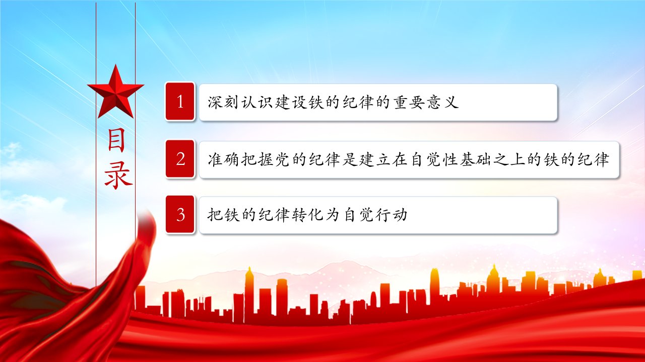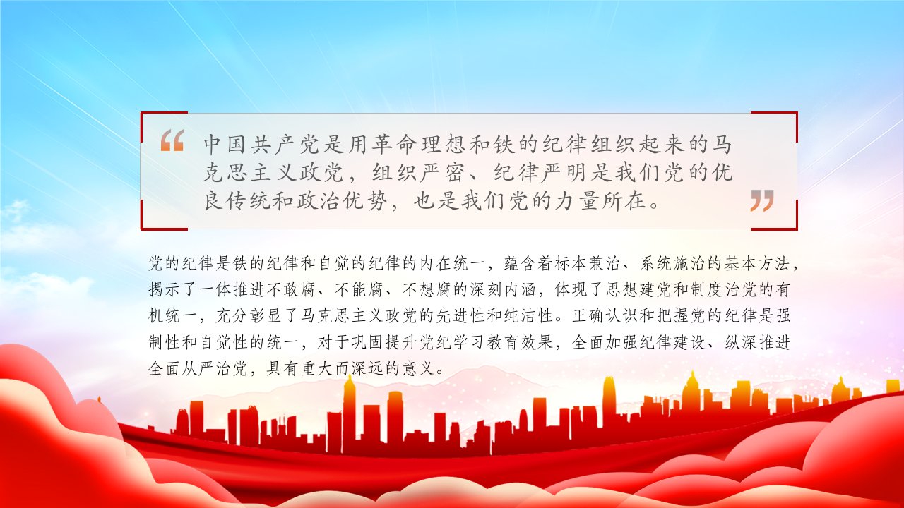 2024微党课党的纪律是铁的纪律和自觉的纪律的内在统一,蕴含着标本兼治、系统施治的基本方法,揭示了一体推进不敢腐、不能腐、不想腐的深刻内涵,体现了思想建党和制度治党的有机统一,充分彰显了马克思主义政党的先进性和纯洁性党课ppt模板(含配套讲稿)党员干部学习党课课件