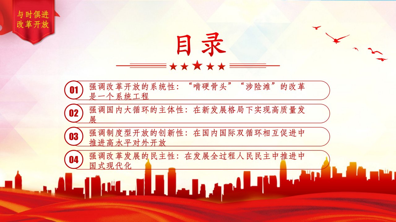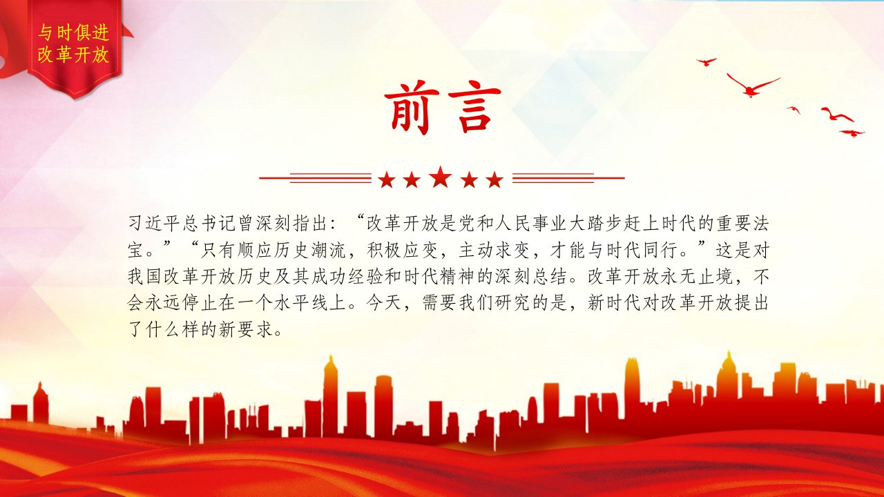 2024微党课总书记曾深刻指出:“改革开放是党和人民事业大踏步赶上时代的重要法宝。”“只有顺应历史潮流,积极应变,主动求变,才能与时代同行。”这是对我国改革开放历史及其成功经验和时代精神的深刻总结(带内容)讲党课ppt模板下载