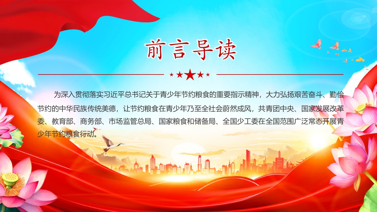 2024微党课为深入贯彻落实习近平总书记关于青少年节约粮食的重要指示精神,大力弘扬艰苦奋斗、勤俭节约的中华民族传统美德,让节约粮食在青少年乃至全社会蔚然成风,共青团中央、国家发展改革委、教育部、商务部、市场监管总局、国家粮食和储备局、全国少工委在全国范围广泛常态开展青少年节约粮食行动党课ppt模板(含配套讲稿)党员干部学习党课课件