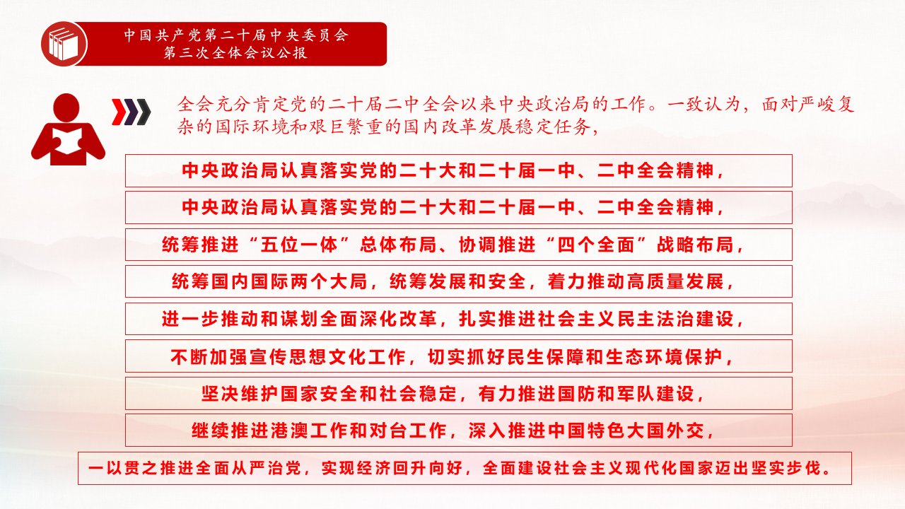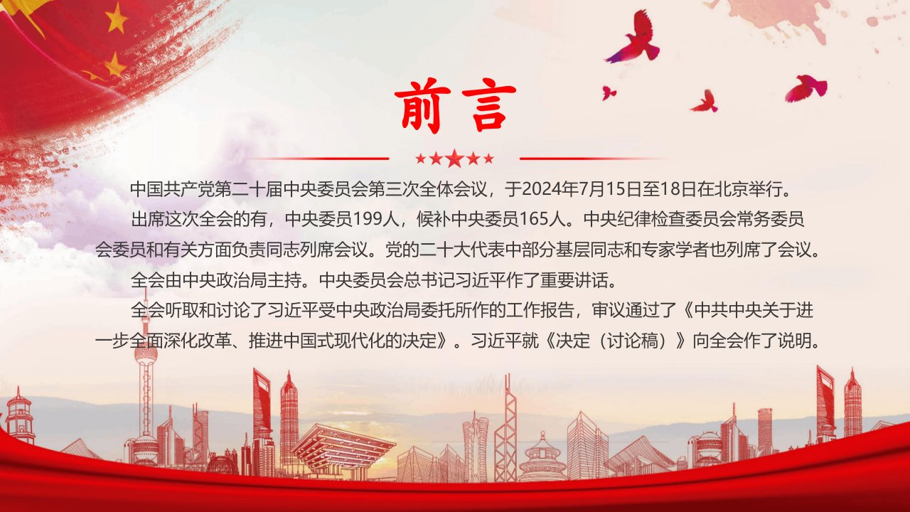 中国共产党第二十届中央委员会第三次全体会议,于2024年7月15日至18日在北京举行统筹国内国际两个大局,统筹发展和安全,着力推动高质量发展坚决维护国家安全和社会稳定,有力推进国防和军队建设党课ppt模板(含配套讲稿)党员干部学习党课课件