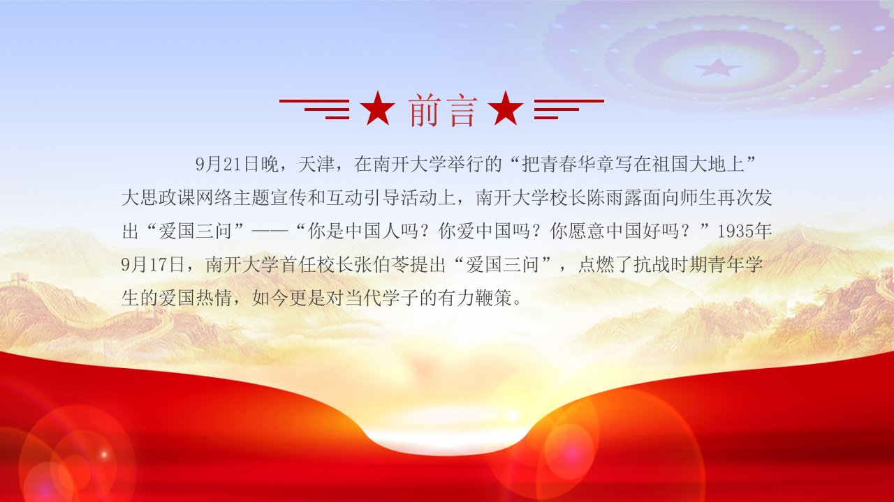 党课ppt,党课ppt模板,新时代,思政课,党课,大思政课,ppt模板2024微党课【爱国活动ppt】把青春华章写在祖国大地上“爱国三问”的新时代回答大思政课党课ppt模板(含配套讲稿)党课ppt,党课ppt模板,新时代,思政课,党课,大思政课,ppt模板2024微党课【爱国活动ppt】把青春华章写在祖国大地上“爱国三问”的新时代回答大思政课党课ppt模板(含配套讲稿)