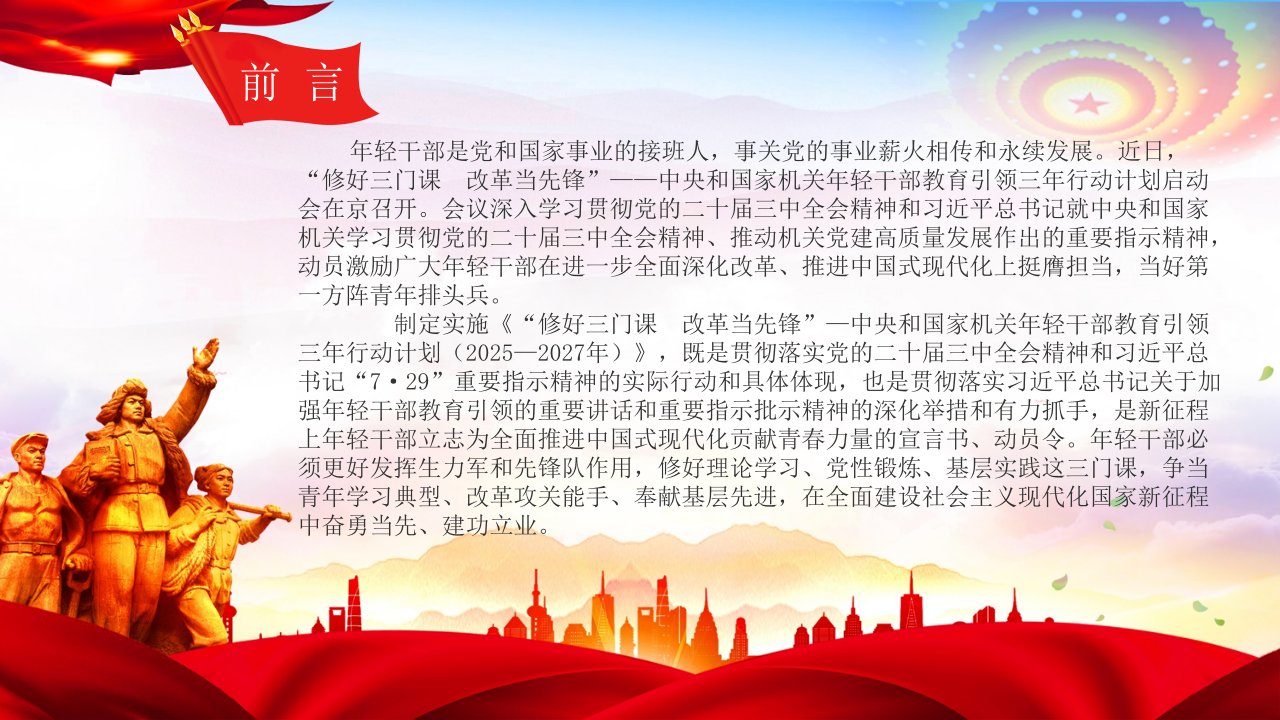 2025微党课「争当排头兵ppt」修好三门课当好第一方阵青年排头兵改革当先锋党课ppt模板(含配套讲稿)