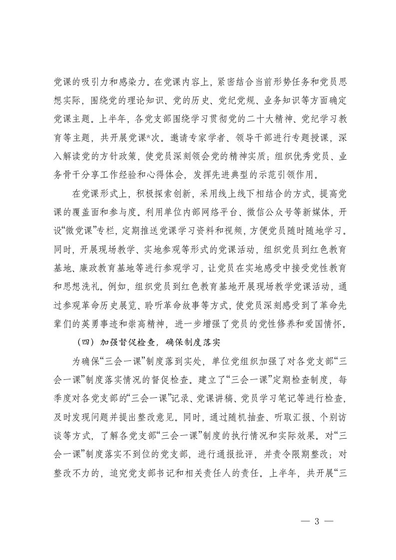 2025年上半年三会一课制度落实情况总结报告办公室第一党支部落实全面从严治党主体责任工作情况报告