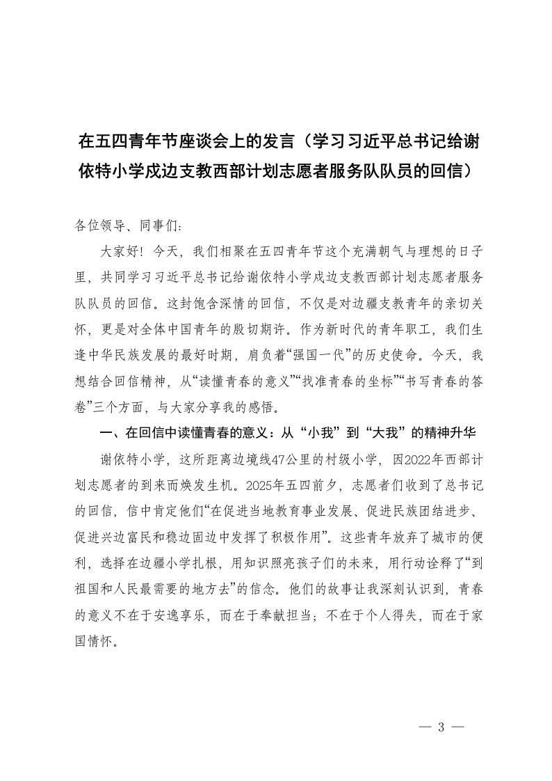 标题:2025年学习给谢依特小学戍边支教西部计划志愿者服务队全体队员回信发言稿