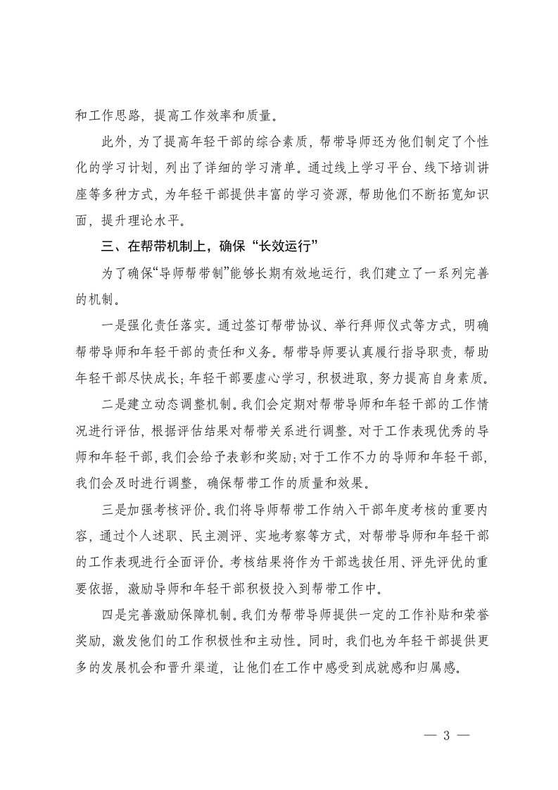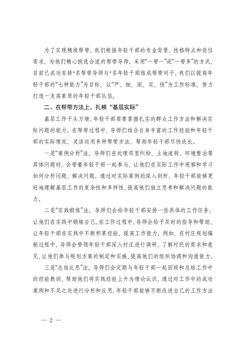 标题:2025年关于乡镇加强年轻干部传帮带工作的情况汇报在导师制传帮带工作推进会上的汇报发言