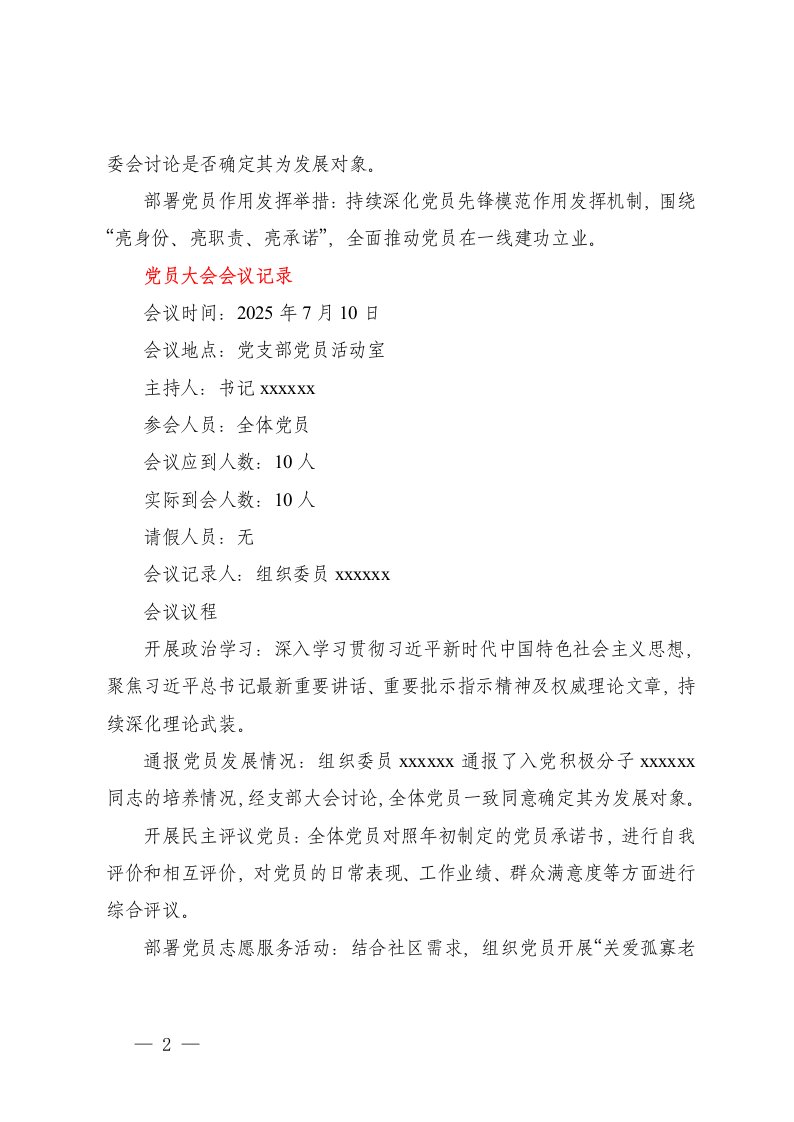 基层党支部2025年7月三会一课会议记录支部委员会党小组会议党员大会党课记录三会一课参考方案