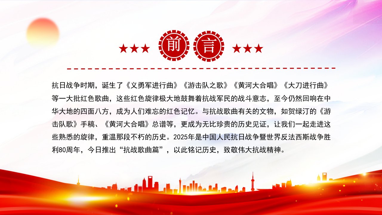 「抗战精神ppt模板」重温抗战歌曲红色旋律见证民族的抗争党课ppt模板(带内容)