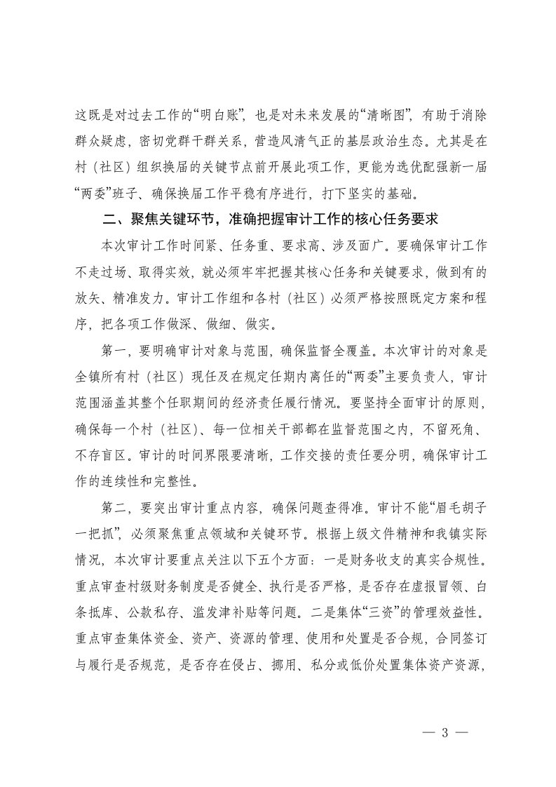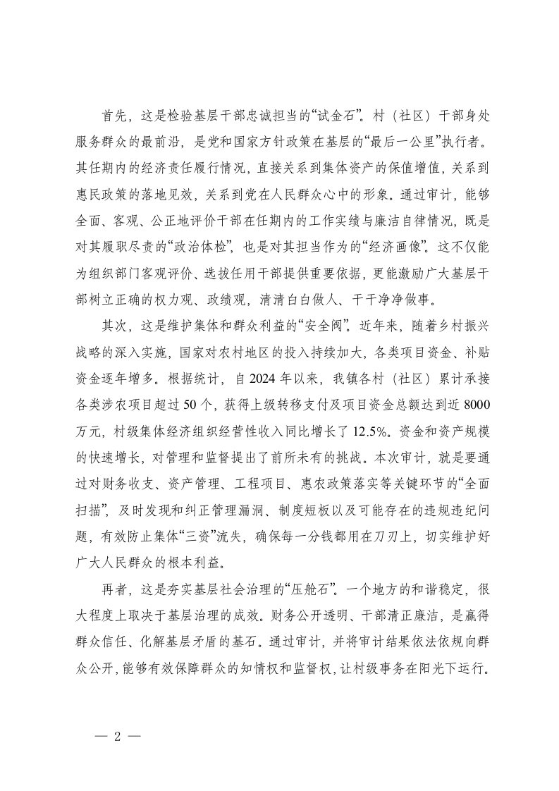 标题:在2025年全镇村社区两委成员任期和离任审计工作动员部署会上的讲话审计工作启动会上的讲话