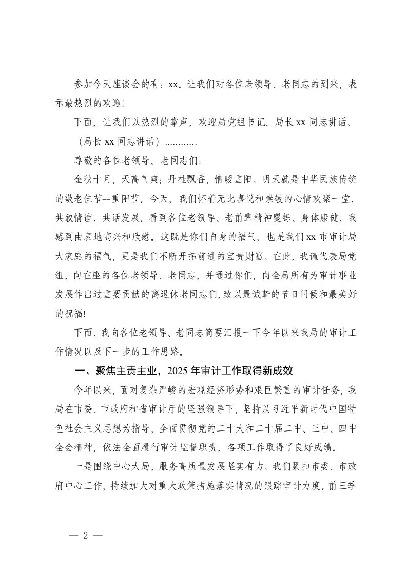 标题:2篇审计局2025年重阳节老干部座谈会主持词及领导讲话