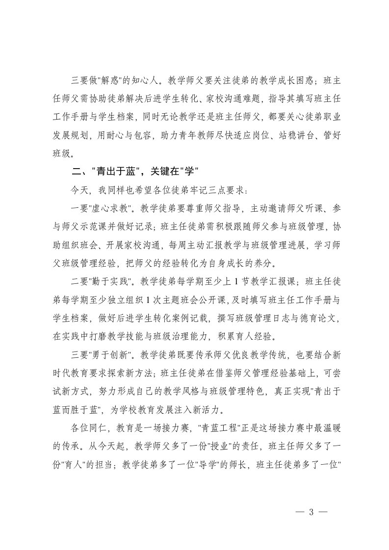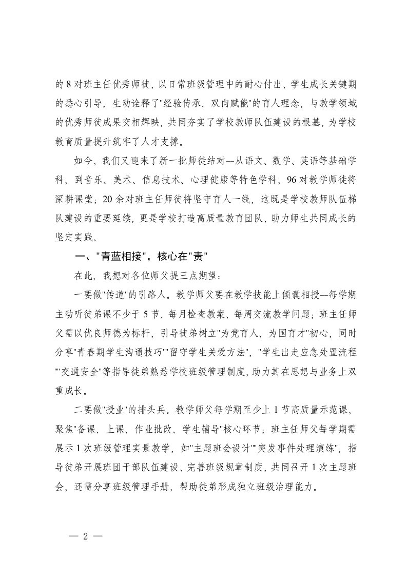 中学党委书记在青蓝工程师徒结对仪式上的讲话教育局领导班子扩大会议上的讲话开学工作会议上的讲话