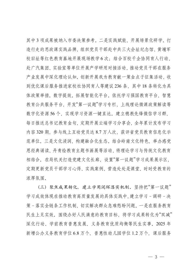 2025年教育局党组关于落实第一议题学习制度工作情况的报告党员领导干部在学习习近平谈治国理政第五卷专题研讨会上的发言讲话材料