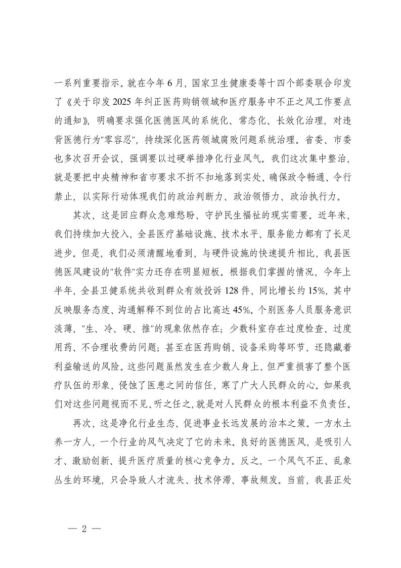 标题:2025年在全县医疗卫生机构医德医风问题集中整治工作动员部署会上的讲话