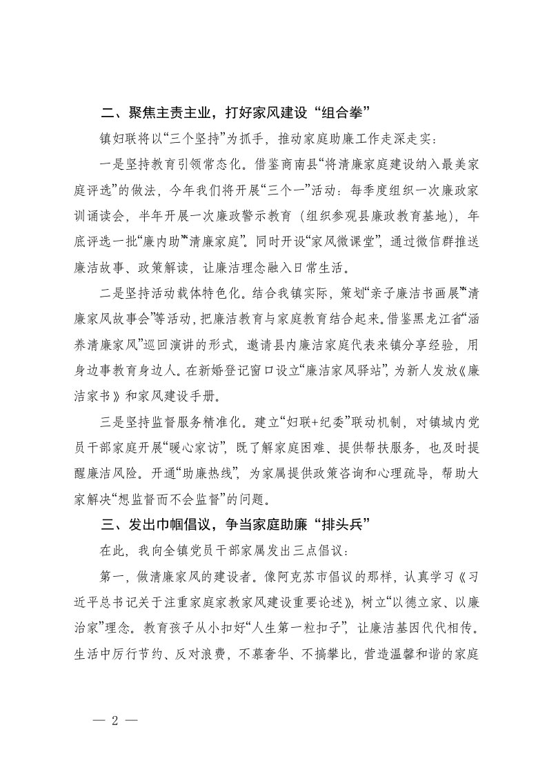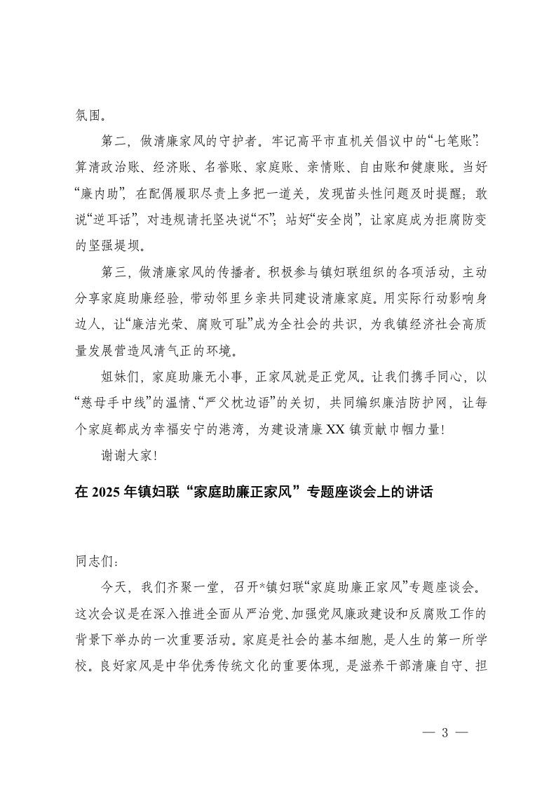 标题:2篇在2025年镇妇联家庭助廉正家风专题座谈会上的讲话