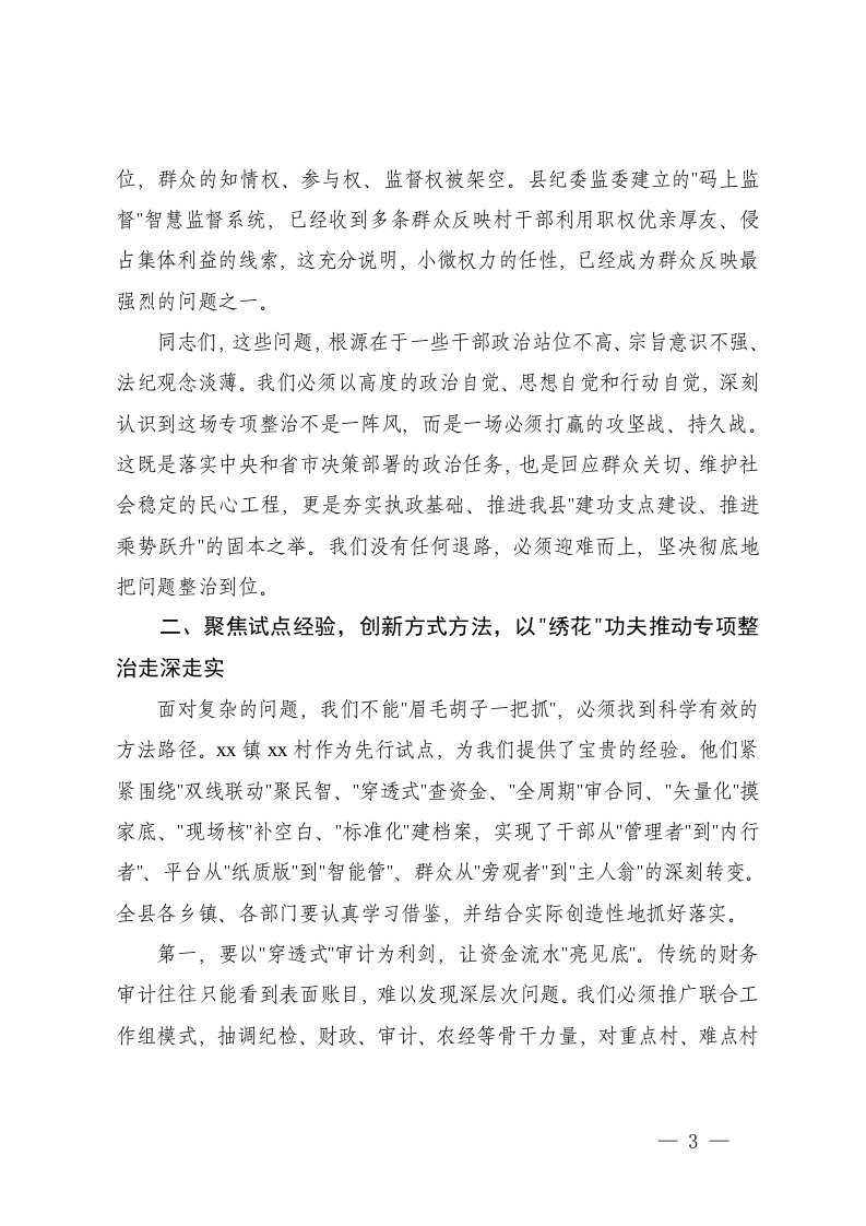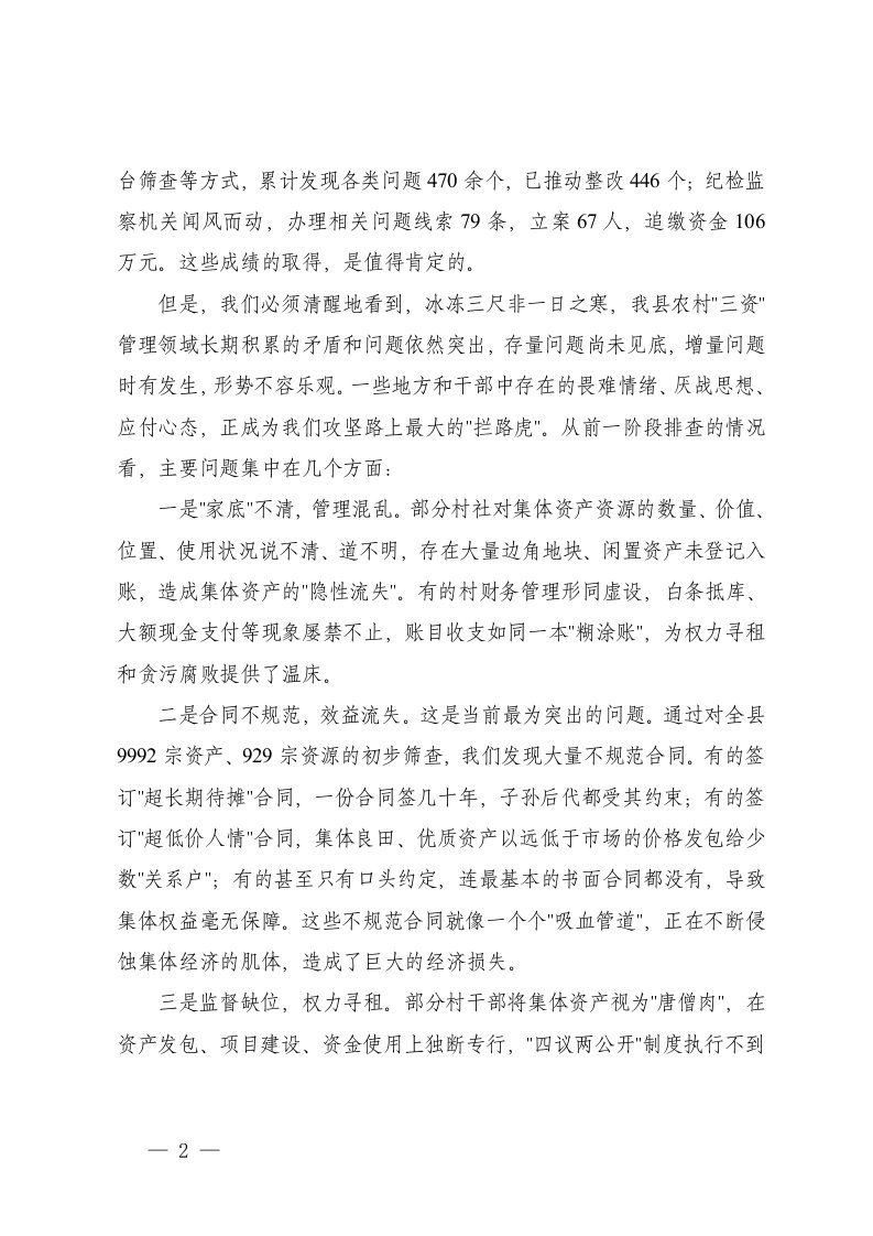 标题:在全县农村集体三资管理突出问题专项整治攻坚推进会上的讲话及主持词