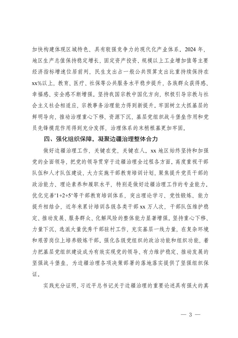 标题:3篇2025年在学习习近平总书记关于边疆治理的重要论述专题研讨会议上的交流发言