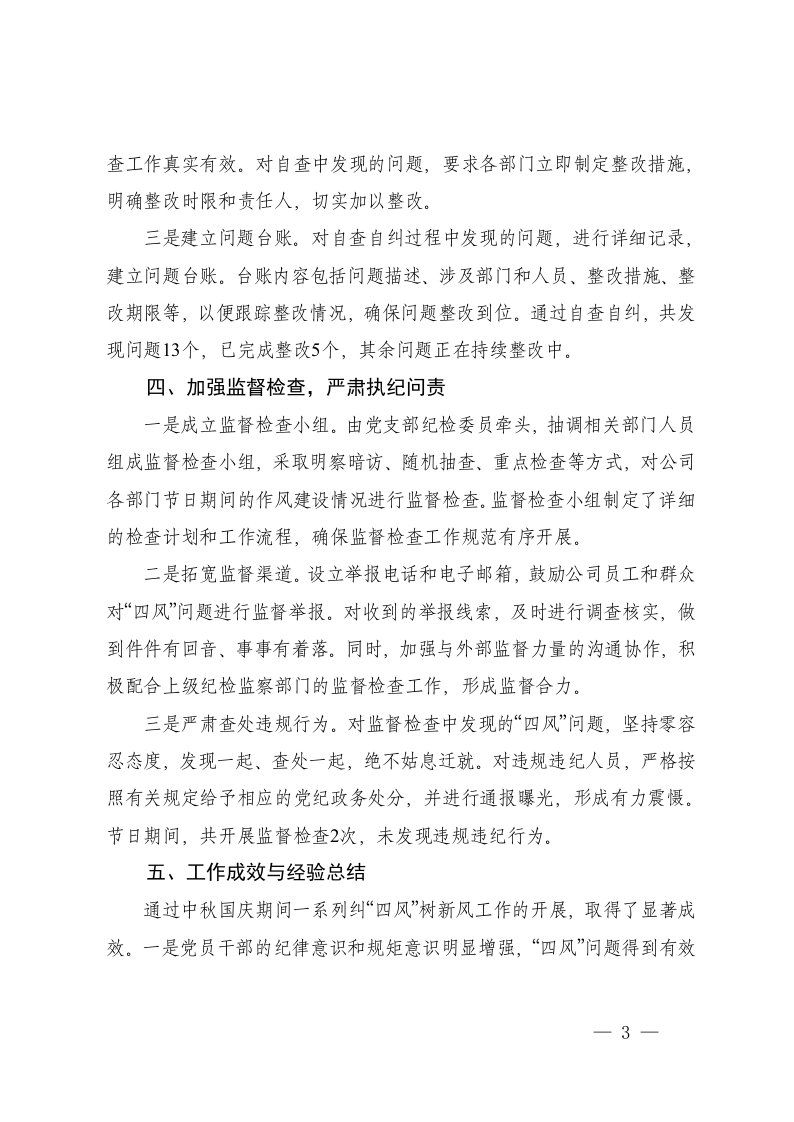 标题:3篇2025年党支部中秋国庆节日期间纠四风树新风工作开展情况报告