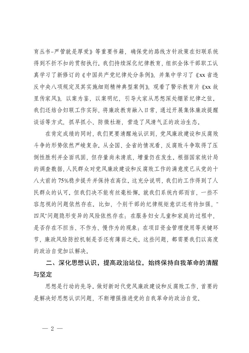 标题:在党总支妇女联合会2025年党风廉政建设和反腐败工作推进会议上的讲话