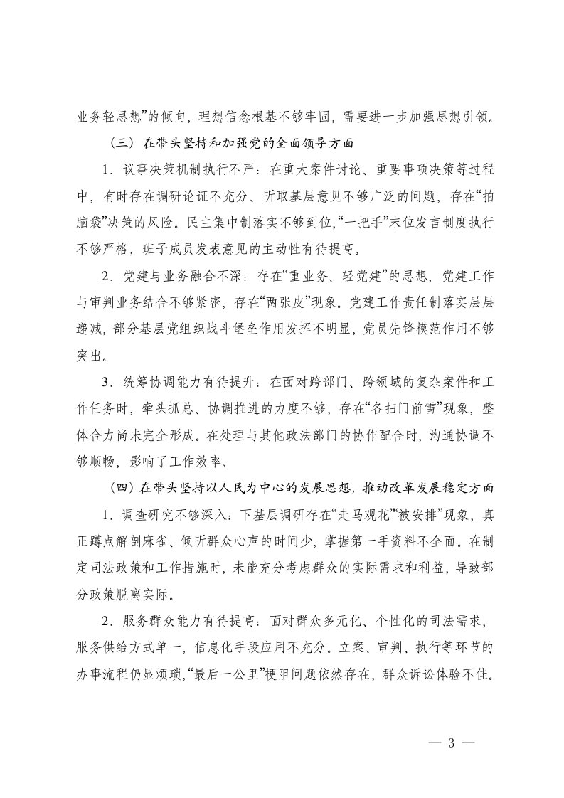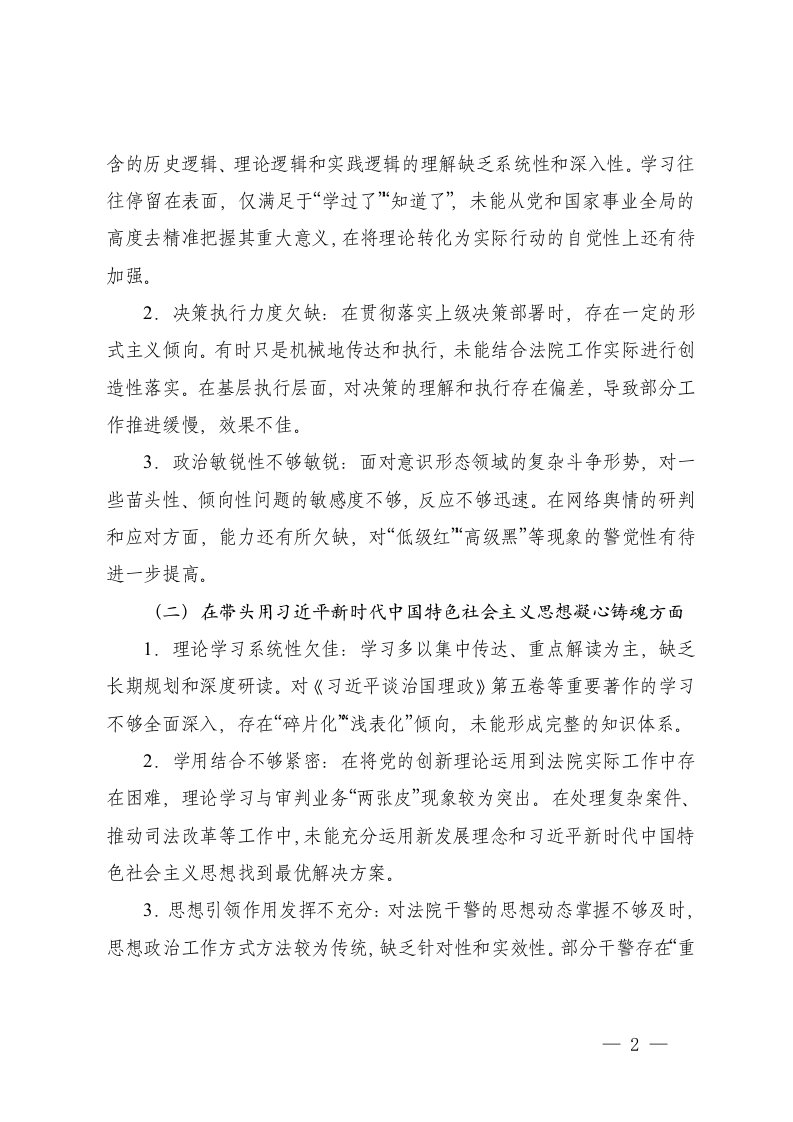 六个带头法院2025年度围绕在深刻领悟两个确立的决定性意义坚决做到两个维护方面在带头用习近平新时代中国特色社会主义思想凝心铸魂方面在带头坚持和加强党的全面领导等六个方面存在的问题及整改措施