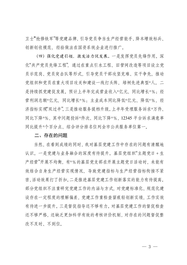 4篇公司党委书记2025年上半年抓基层党建工作述职报告