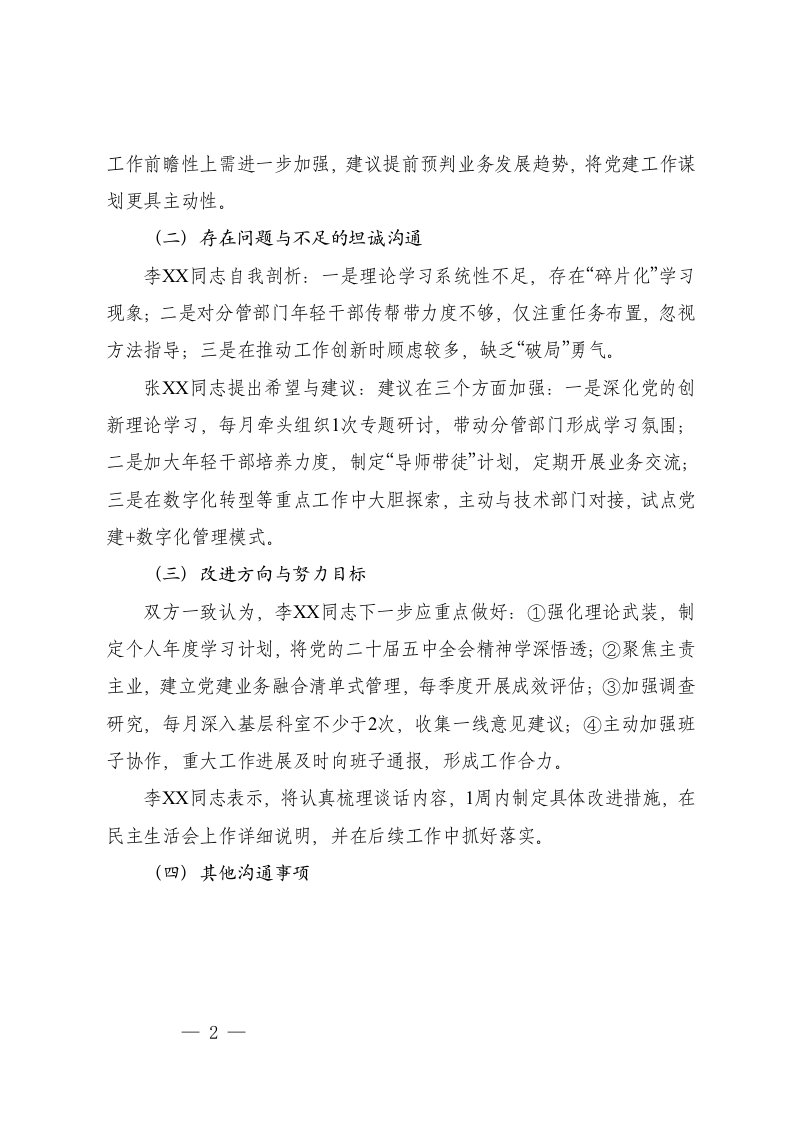 标题:党委领导班子成员2025年度民主生活会会前谈心谈话记录