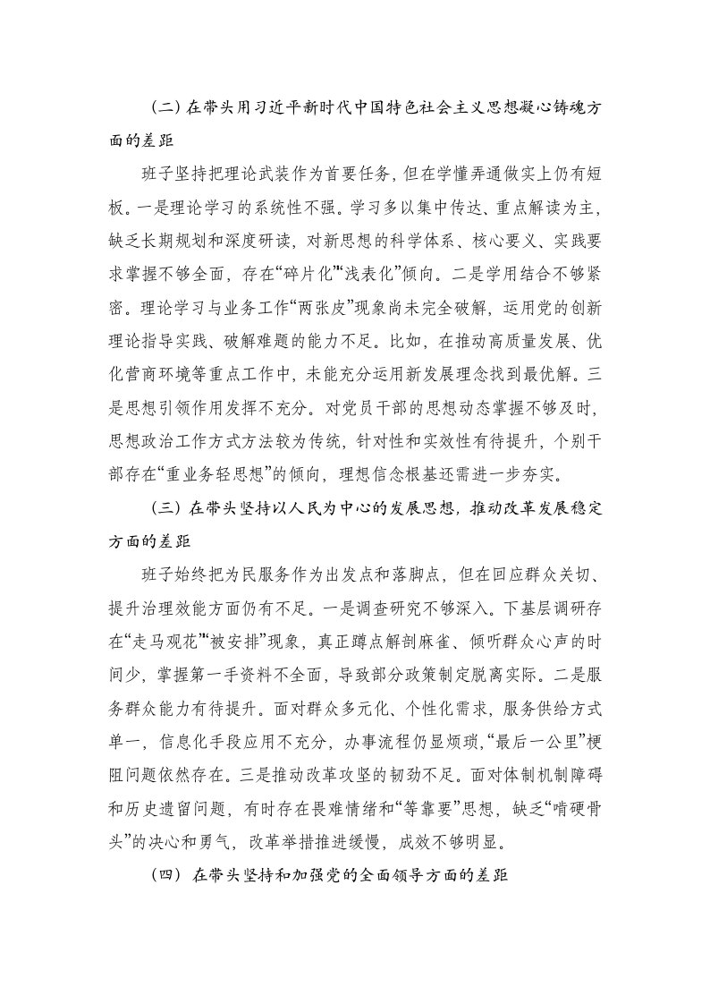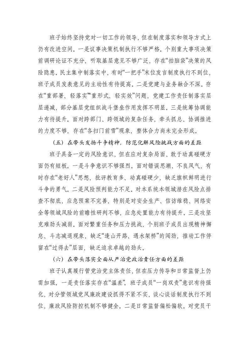 领导班子2025年度民主生活会对照检查材料在带头用党的创新理论凝心铸魂引领司法方向方面存在的差距六个带头
