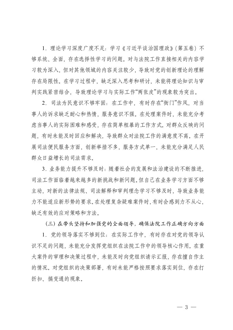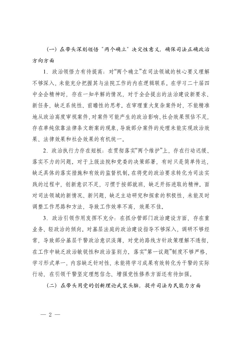 六个带头法院2025年度民主生活会个人对照检查发言提纲在带头深刻领悟两个确立决定性意义确保司法正确政治方向方面在带头用党的创新理论武装头脑提升司法为民能力方面