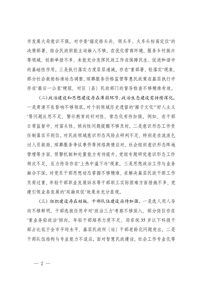 民政局党组领导班子2025年巡视整改专题民主生活会对照检查材料政治建设和思想建设存在薄弱环节政治生态建设需持续深化