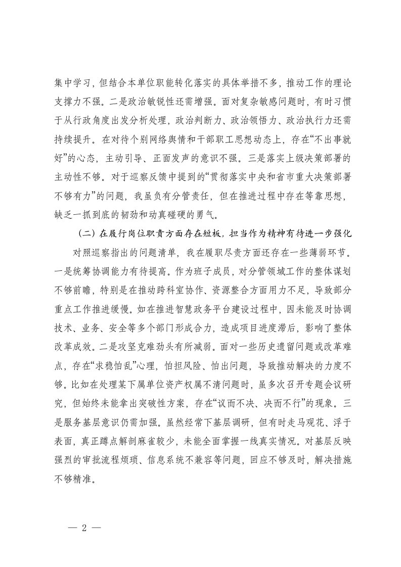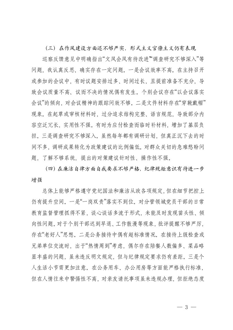 2025年度局巡察反馈意见整改专题民主生活会个人对照检查材料在作风建设方面还不够严实形式主义官僚主义仍有表现在廉洁自律方面自我要求不够严格纪律规矩意识有待进一步增强
