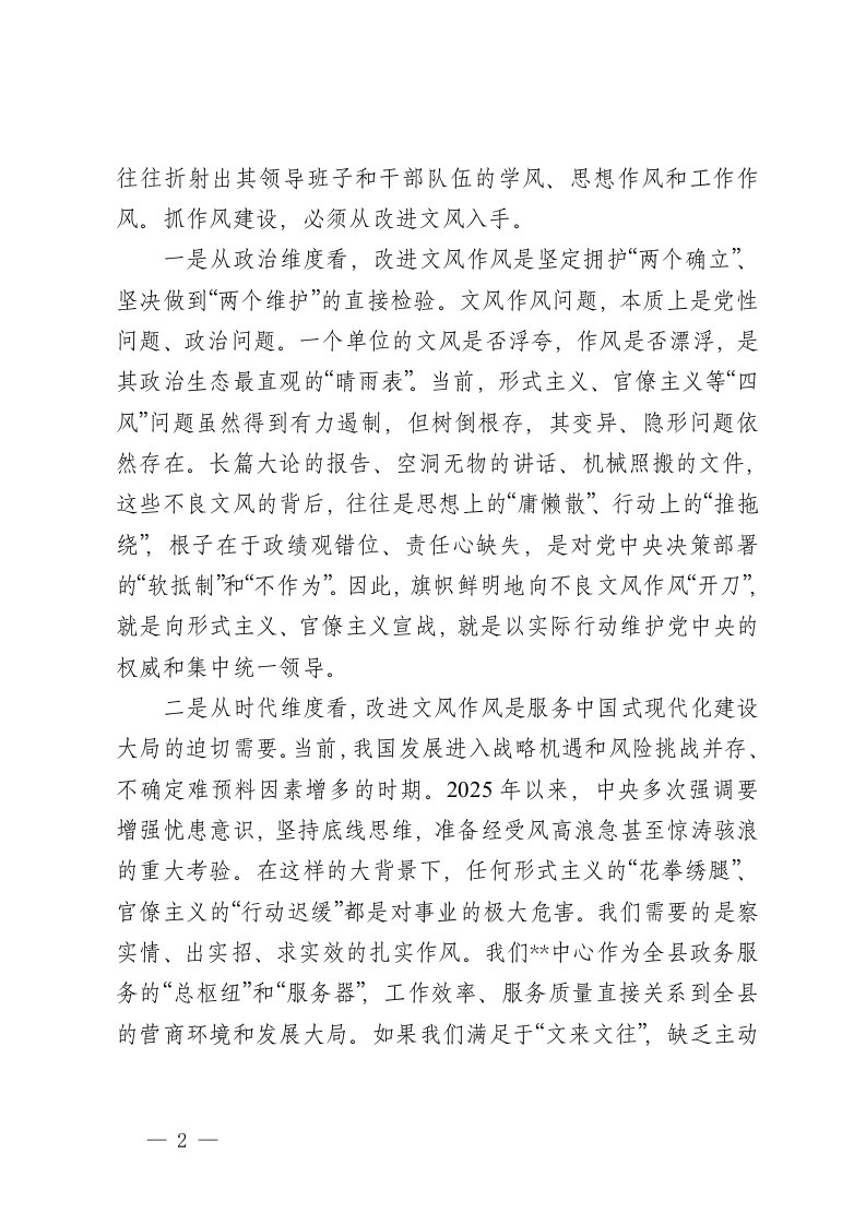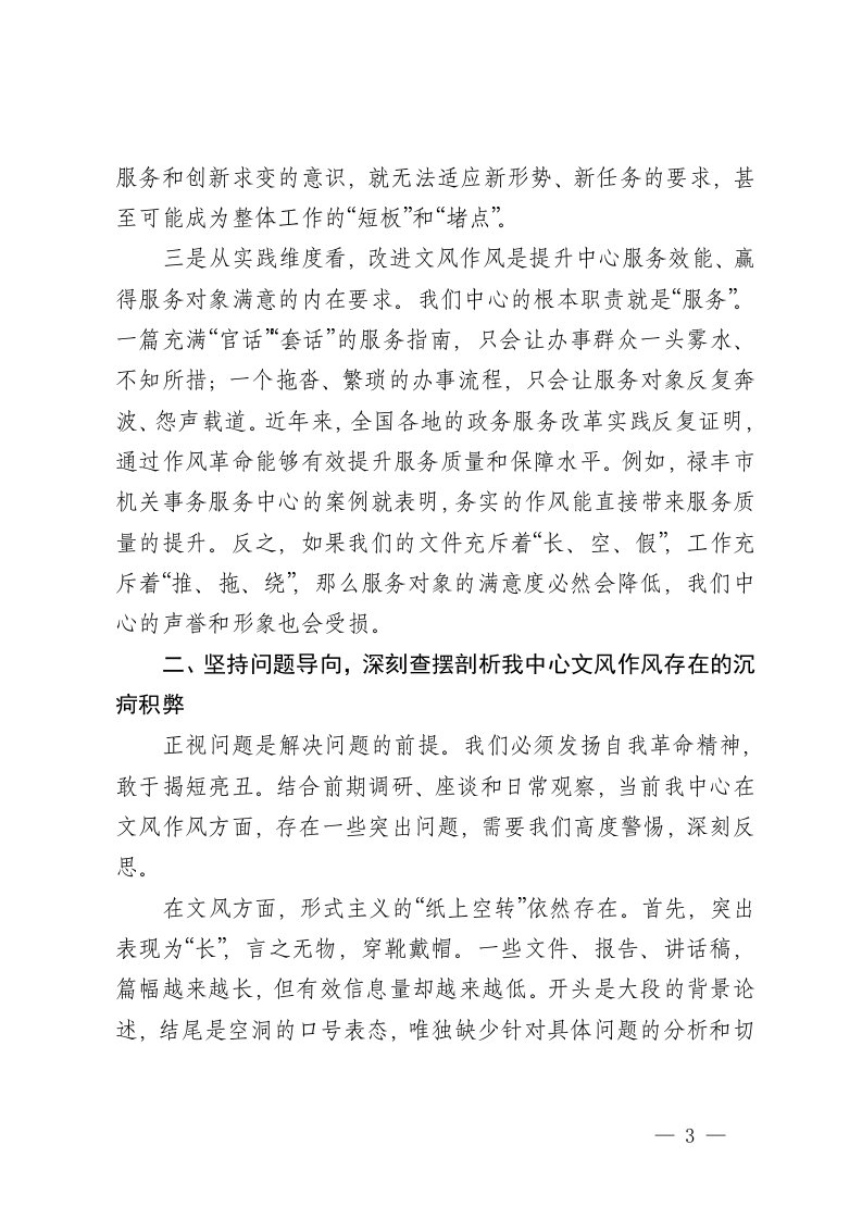 标题:2025-2026年在中心党组改文风转作风专题研讨会上的发言