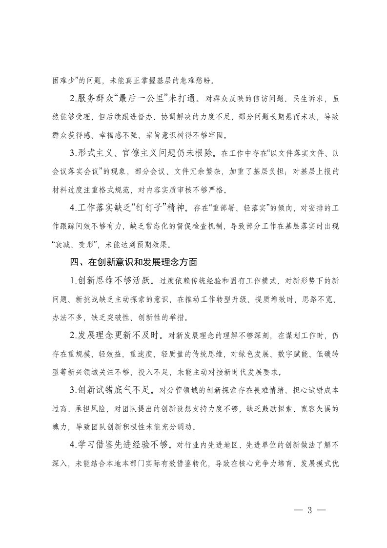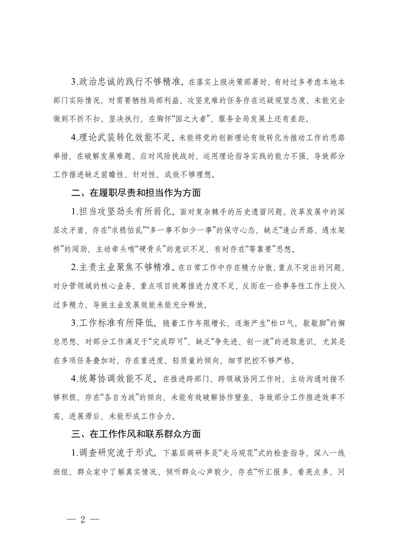 在政治忠诚和理论武装方面在履职尽责和担当作为方面在工作作风和联系群众方面在创新意识和发展理念方面在廉洁自律和修身养德方面2025年度民主生活会组织生活会个人对照检查意见存在问题