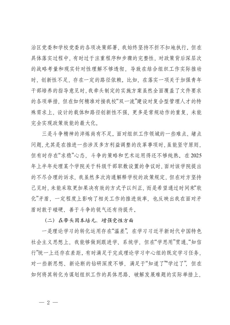 高校党委常委组织部部长2025年度民主生活会个人对照检查材料五个带头