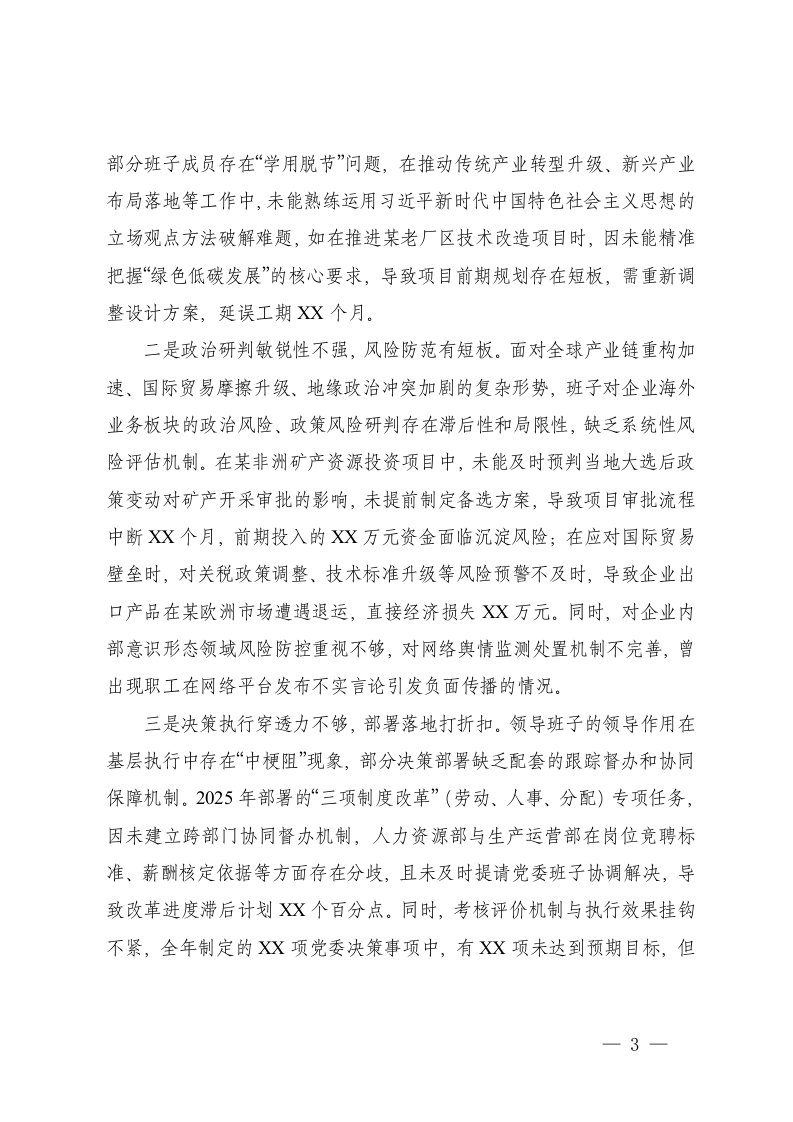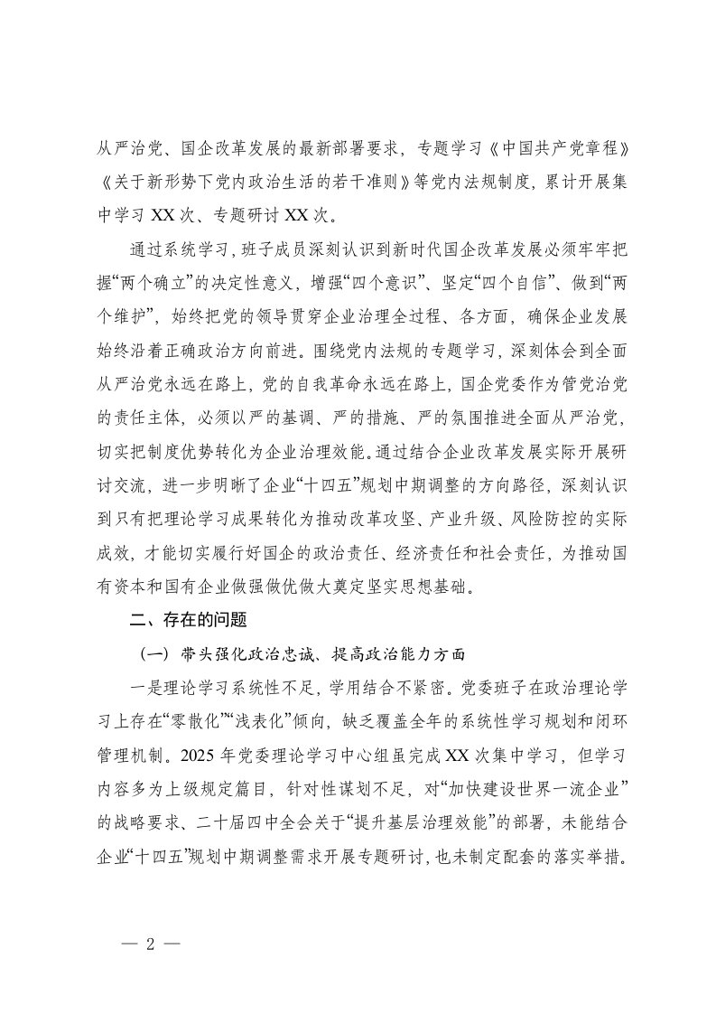 带头强化政治忠诚提高政治能力方面2025年国企党委班子聚焦五个带头民主生活会对照检查