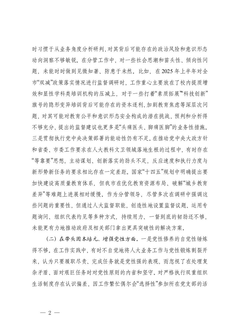 标题:分管教科文卫工作副主任2025年度民主生活会个人五个带头对照检查材料