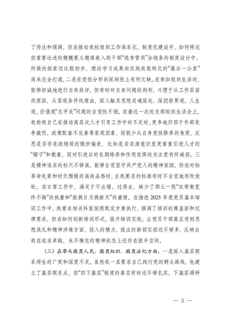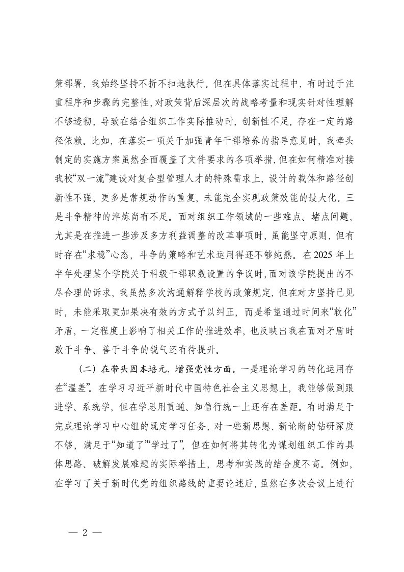 标题:高校党委组织部长2025年度民主生活会个人对照检查材料五个带头
